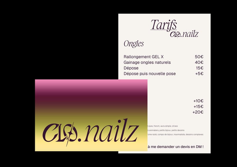 Réalisation de l'identité visuelle de Clo.nailz dans une ambiance "catchy", maximaliste et colorée, dynamique et accessible.